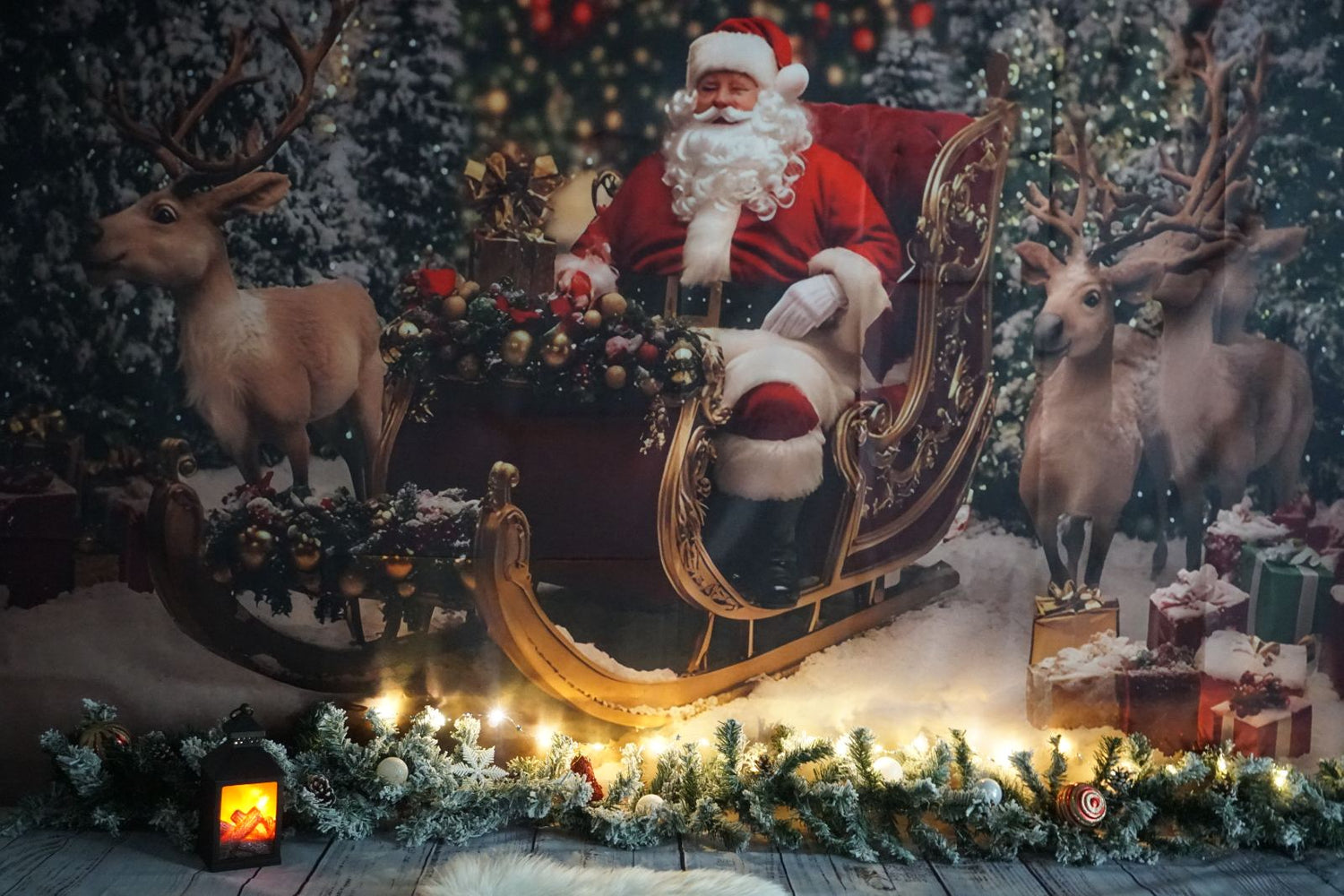 Дядо Коледа, еленът и празничната украса създават уютна атмосфера за детски и семейни фотосесии.